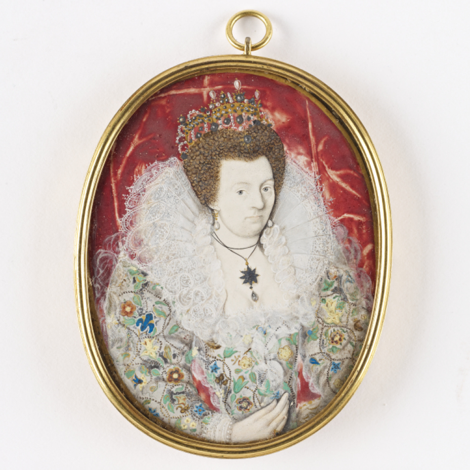 A lady, formerly called Frances Howard, Duchess of Lennox and Richmond (1576-1639), circa 1600, almost full face, wearing a white dress richly embroidered with coloured flowers, with a high white lace collar, wearing a tiara, red curtain background. On vellum oval, 3in. high. Can be viewed at Bowhill House.