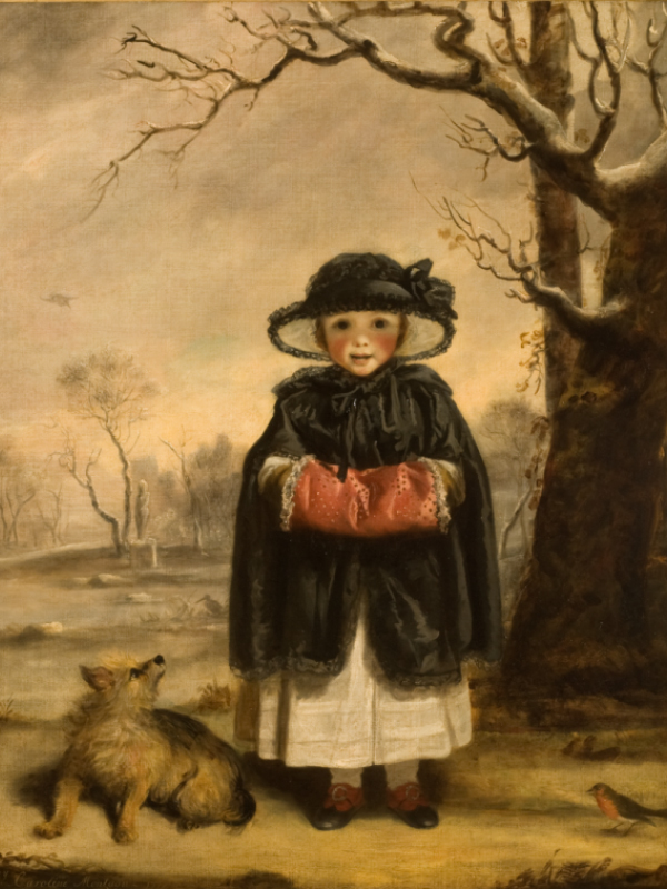 ‘Winter’: Portrait of Caroline Scott, later Marchioness of Queensberry (1774- 1854), daughter of Henry, 3rd Duke of Buccleuch, as a child, full-length, in white skirt and black cloak, with black hat, her hands in lace-edged red silk muff, standing in a snowy landscape beside a tree, with a robin perched near her and a terrier at her side looking up at her. Dated ‘1777’ and with identifying inscription.