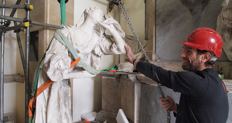 Prior to the HLF funded project, concern had been growing as to the structural integrity of the monument to John, 2nd Duke of Montagu, due to evidence of corrosion affecting the iron rods which support the life size figures of Charity and the Duchess Mary in Roubiliac’s sculpture. The corrosion had caused the whole structure to move, putting the figure of Charity into compression, so that she was in immediate danger of shattering or collapse. The monument to Lady Elizabeth, Duchess of Buccleuch, also gave great concern with the crumbling (or ‘sugaring’) of the left-hand and arm of the male youth on the west side of the niche. It was also agreed that all of the monuments were in need of specialist cleaning, due to decades of build-up of soot and grime, exacerbated by smoke from coke-fuelled heaters, previously a heating source for the Church.